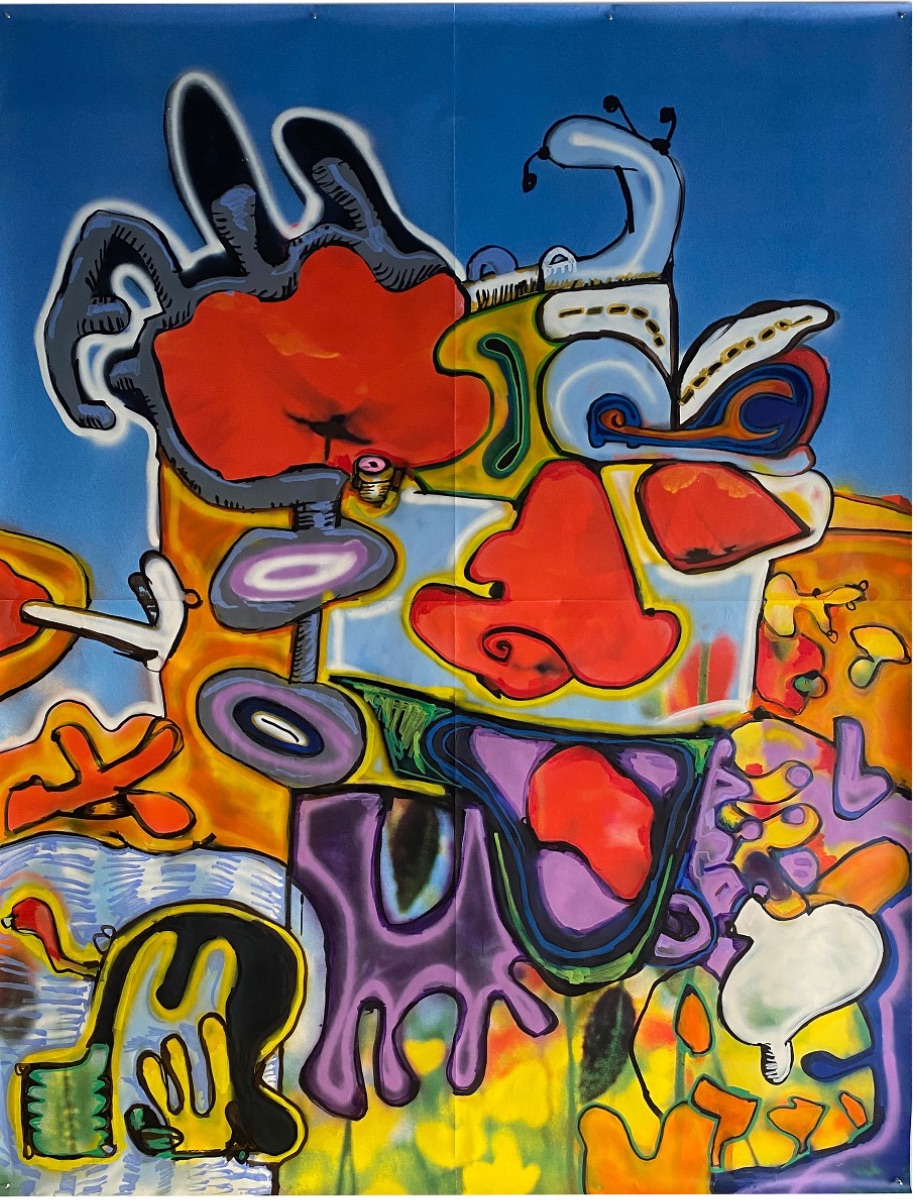 Shown Above: "Throwing Crayons at a Goat" (2022) acrylic on canvas. 48 x 72 inches.